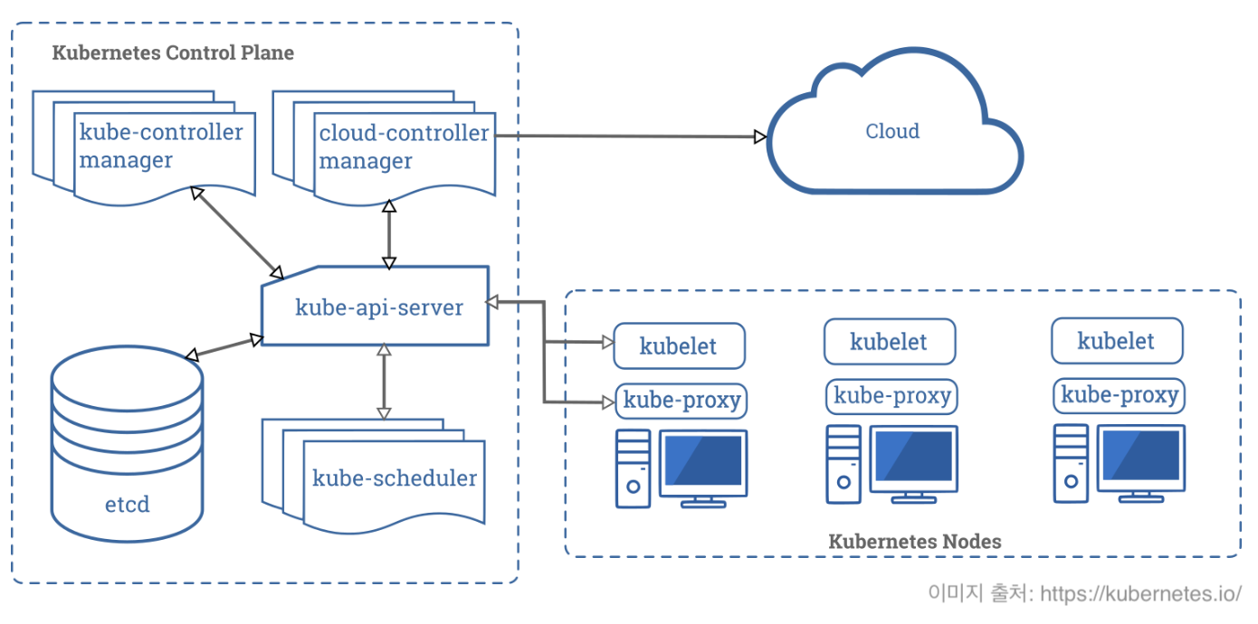 Kubernetes Control Plane을 제공한다. 클러스터에 대한 전반적인 결정을 수행하고 이벤트를 감지하고 이에 대응한다.