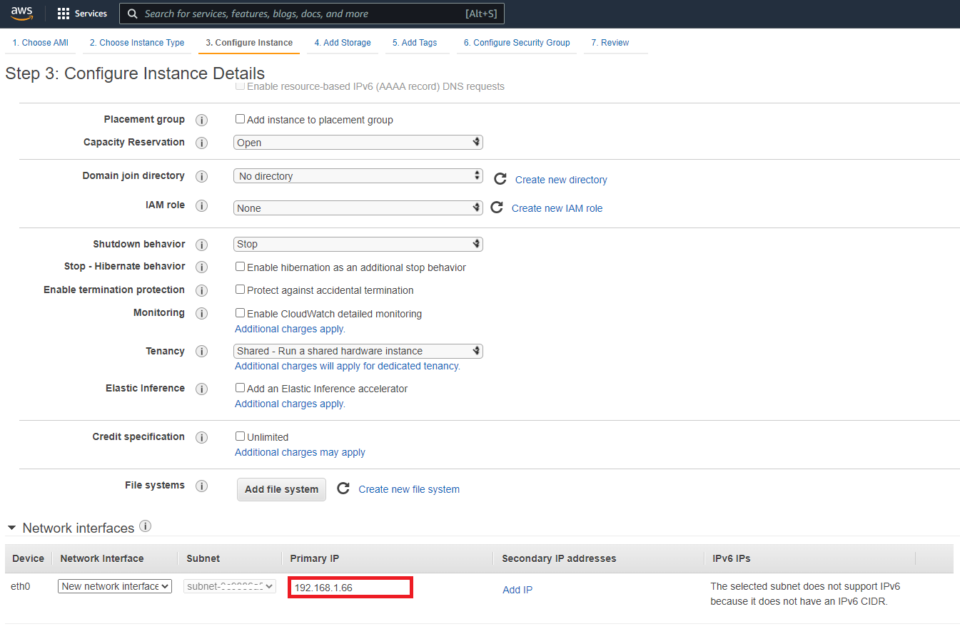 2. Configure Instance 단계에서 Network interfaces 탭에서 Primary IP 에 사용할 IP를 입력한다.